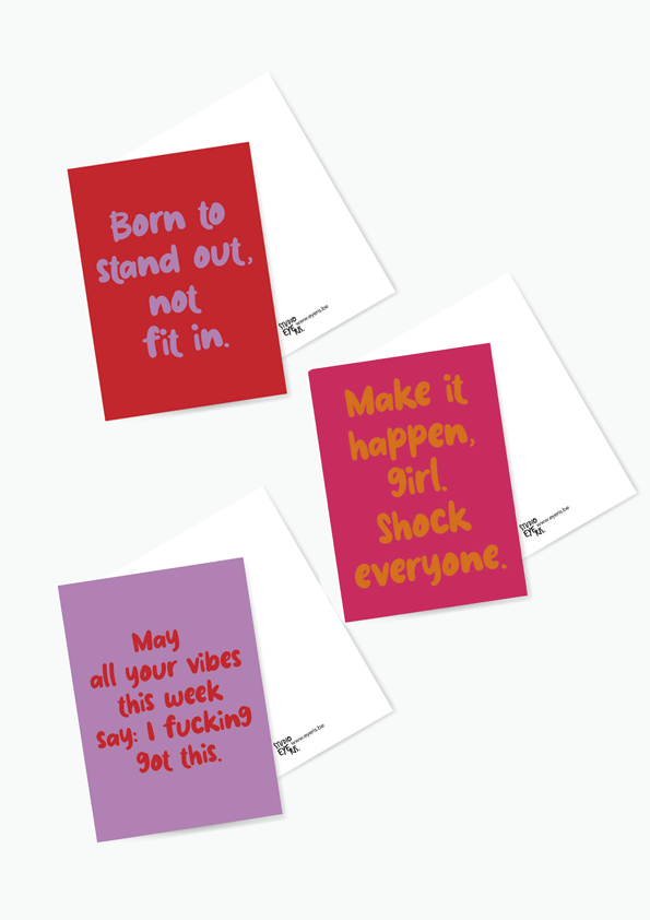 Laat je vibes spreken met deze set van 3 kaarten! Met krachtige quotes zoals “Make it happen girl”, “Shock everyone” en “Born to stand out, not fit in” geef je jezelf of een vriendin een instant motivatie-boost.